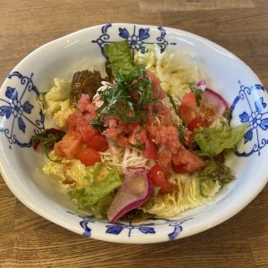 南有馬産の濃厚トマトのシャーベットの上に乗せています。一緒に混ぜてお召し上がりください。ひんやりと冷えた素麺が夏にぴったりです。